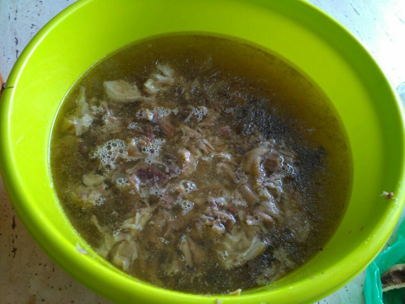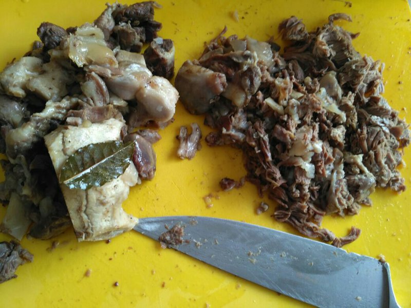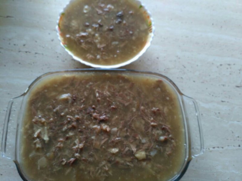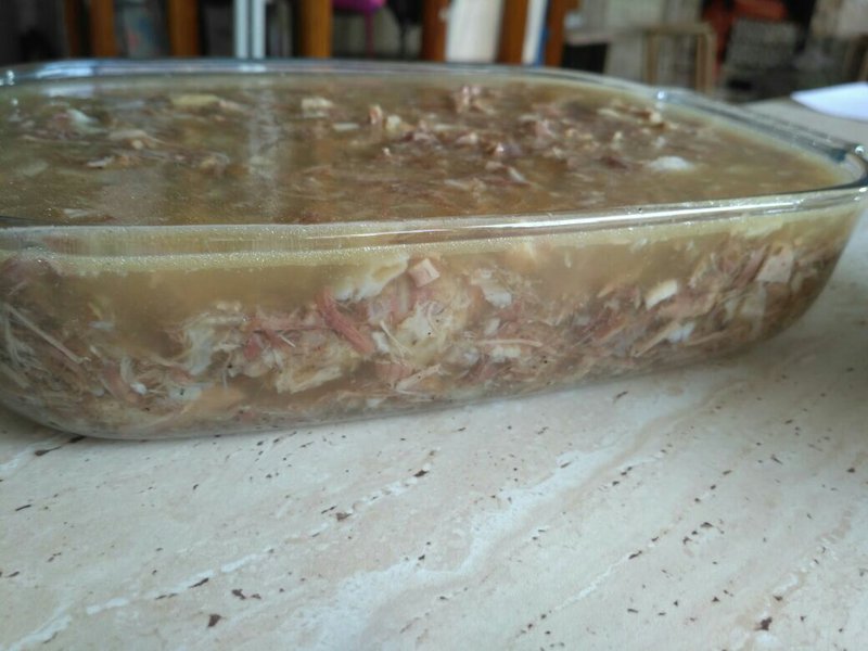 Как сварили, все отделить от кости и порезать ножом , добавить чеснока побольше (1-2 головки), черный перец по вкусу, попробовать на соль, если мало, добавить до прилично соленого вкуса. Разложить по формам /тарелкам на застывание в холод.