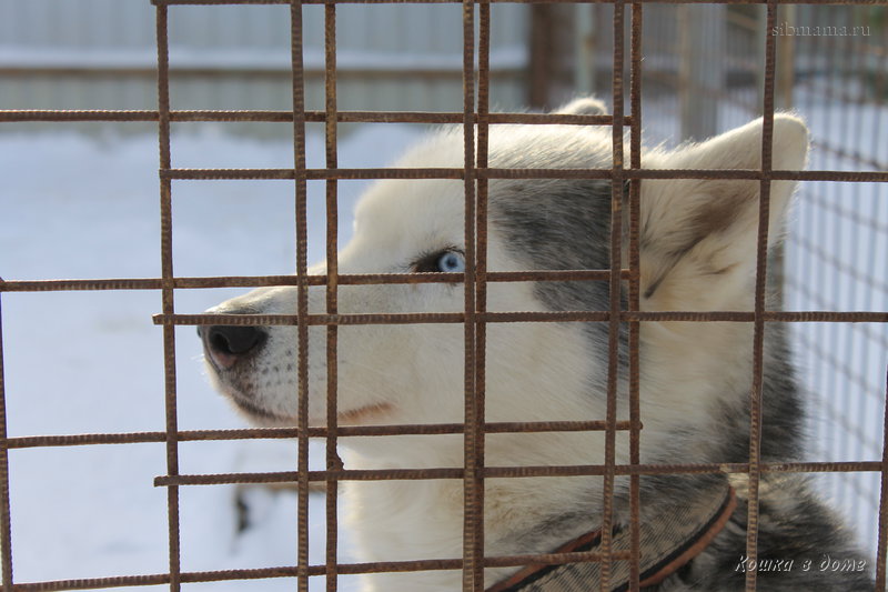 В настоящее время в питомнике 12 взрослых собак и щенки, живут они в разных вольерах. Я была уверена, что хаски практически все голубоглазки, но там только один такой товарищ, и то купленный "для гламура и фотографий" , как сказал Сергей, у остальных глаза карие или медового цвета. Так забавно, все голосили, пели - то-есть не лаяли, а именно завывали на разные голоса, просовывая к нам носы и лапы. На фото собака с широко открытым ртом, так вот, это - песня!)))