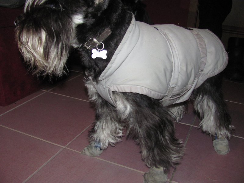 Обувь это и защита от солей и посыпалок, и тепло в сильные морозы, и опять же идеальный закатыватель шерсти. Если не ухаживать за шерстью на лапках, внизу образуются "валенки" из собственной шерсти. Ничто не спасет вас от этого, кроме регулярного тщательного расчесывания. Обувь может быть как самошитая, так и купленная непромокаемая.