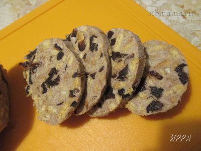 6. И положила в морозильник на 2 часа. Долго держать не стоит, она перемерзнет. Наша задача - подморозить колбаску, чтобы она нарезалась.