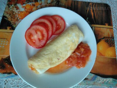 4. Блинчик снимаю на тарелку. Вместо кетчупа у меня домашний вариант его и свежие помидоры.