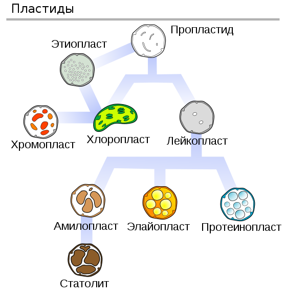 Если растение пребывает в неосвещенном месте, частицы превращаются в этиопласты (проламеллярные тельца), которые имеют сложно сформированную мембранную систему (скопление мембран трубчатой формы). При этом увеличивается объём пропластиды.