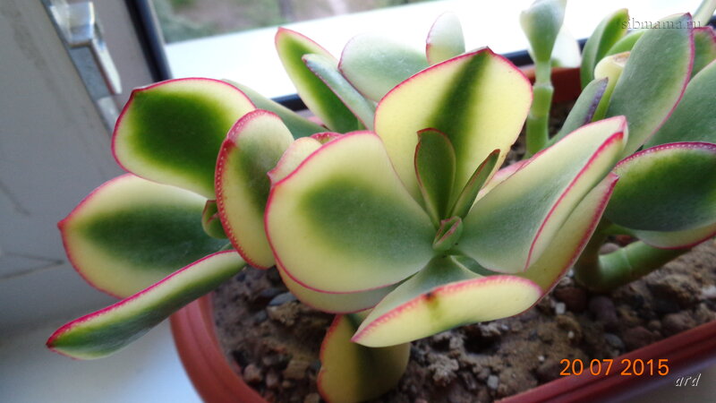 Крассула 'Blue Bird' медиовариегата. Довольно сложный в содержании сорт. Чуть перекормишь азотом, начинают расти зелёные листья. Поэтому выращиваю её вместе с другой крассулой Justus Corderoy. Это помогает избегать перекорма.