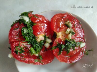 2. Помидоры надрезать крестом чуть меньше чем до половины. Я режу когда как - и с противоположной от плодоножки стороны, и по ней. Результат одинаковый.