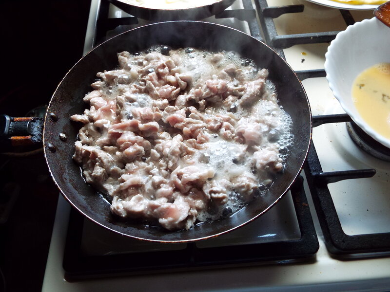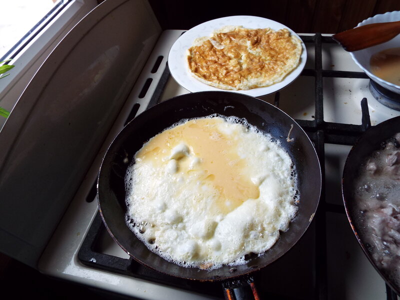 Яйца взболтать с солью и перцем и испечь яичные блинчики.