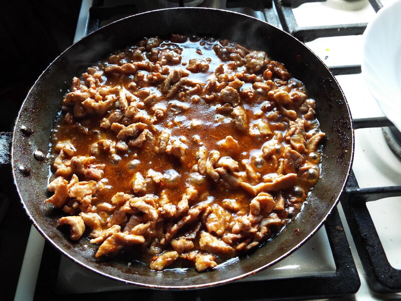 Соуча нужно сделать побольше. Залить этим мясо и тушить на маленьком огне до готовности.