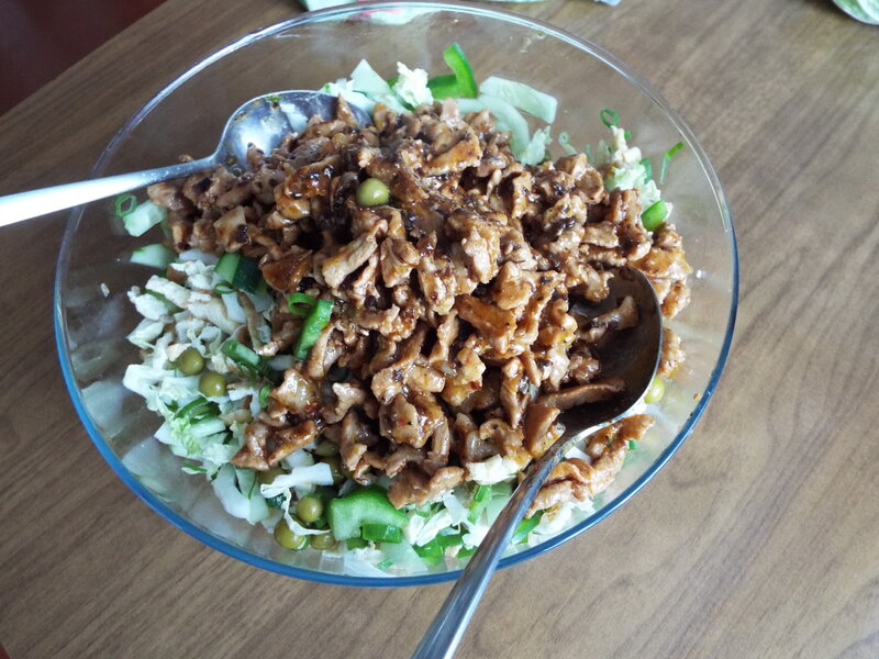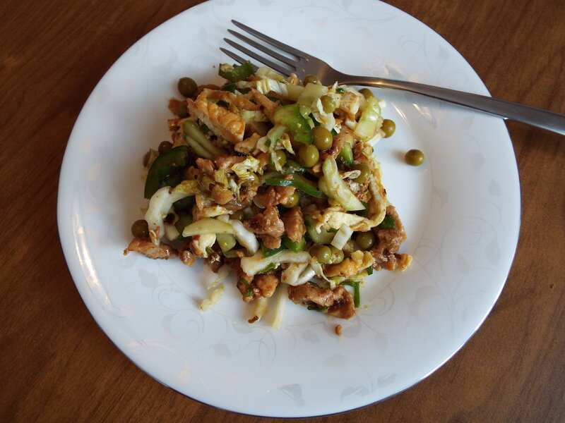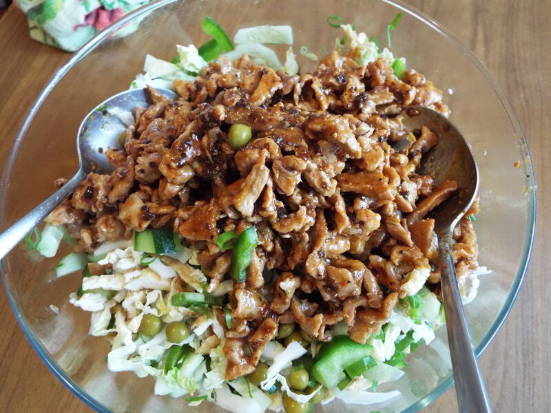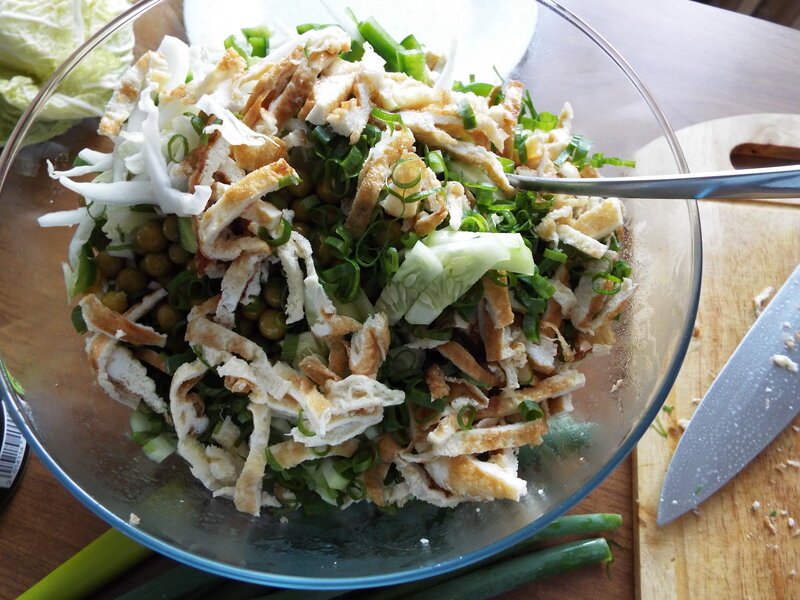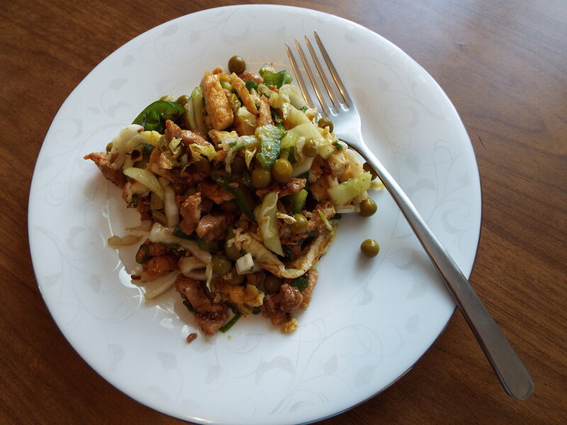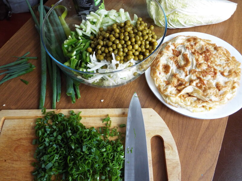 Туда же добавить зеленый горошек, количество по-желанию. А так же яичные блинчики порезанные и мясо вместе с соусом.