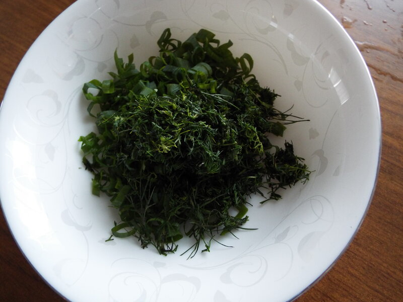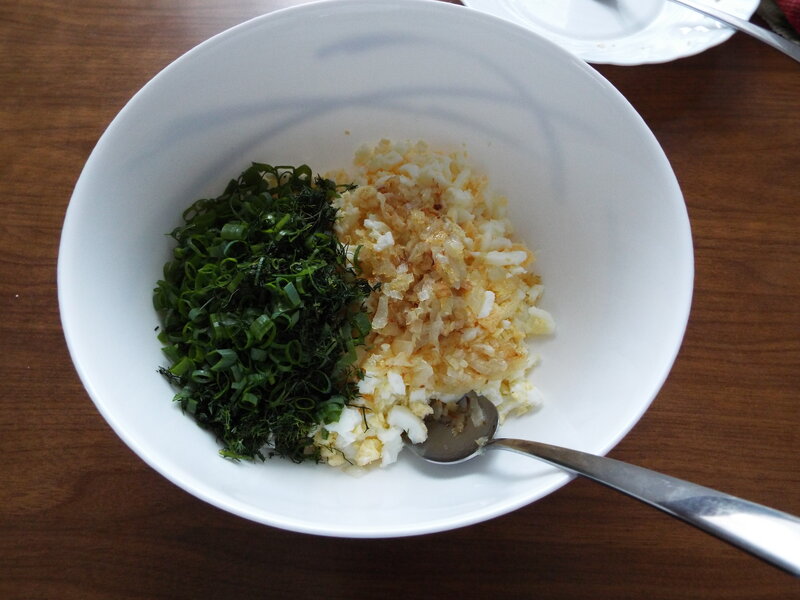 Сложить в чашку обжареный лук (вместе с маслом на которм жарился), порезанную зелень и яйца. Посолить и поперчить.