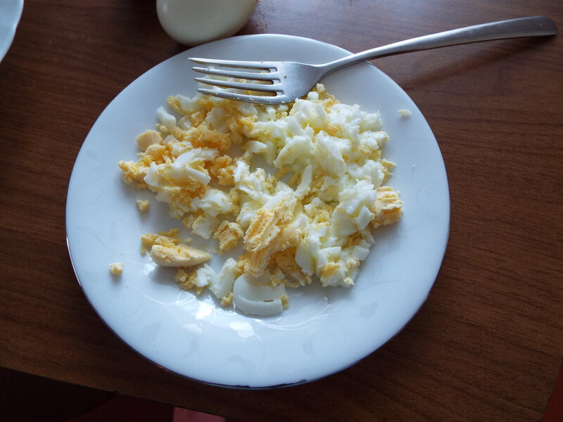 Яйца почистить от скорлупы, а затем можно порезать ножом мелко. А лучше размять вилкой. Это не так красиво, но вкуснее точно, я проверяла .