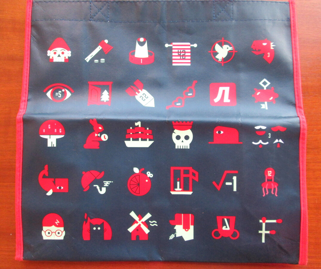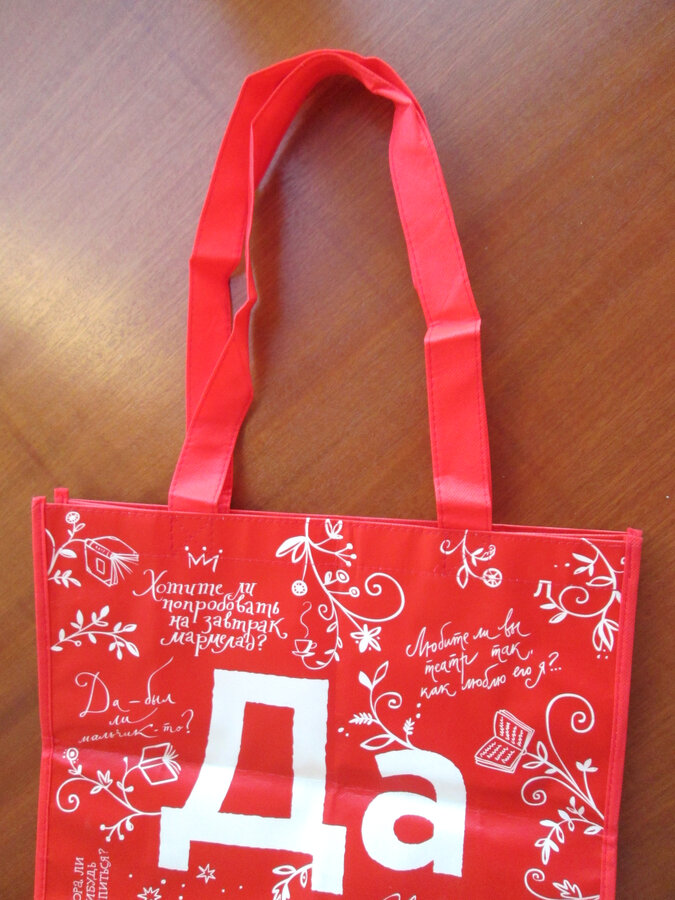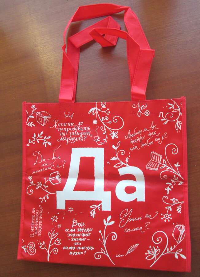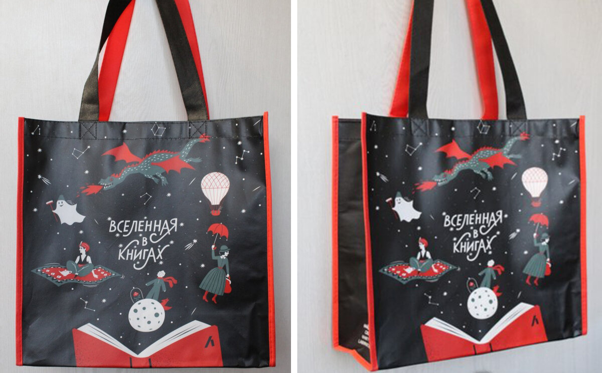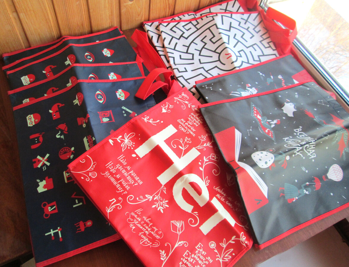 На темном пакете зашифрованы известные книги мира. На красном фразы из известных книг.