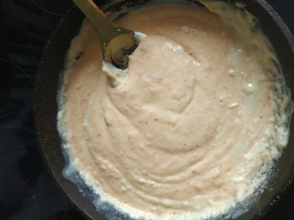 1. Моцарелла придает соусу тягучесть. Не было у меня моцареллы, ее прекрасно в этом конкретном случае заменил плавленый сыр, как раз придав нужную тягучесть.