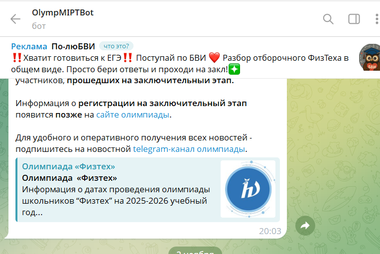Вчера был третий тур математики ФизТеха. В этот раз у меня было побольше времени полюбоваться на современный подход к дистанционным турам. Начнем с того, что физтех олимпиада имеет в Телеге бот, который сообщает о начале тура, конце, апелляции, результатах. Вот, ребенок заскринил: прямо поверх бота идет таргетированная реклама на ТГ канал, где выкладывают разборы во время проведения тура.