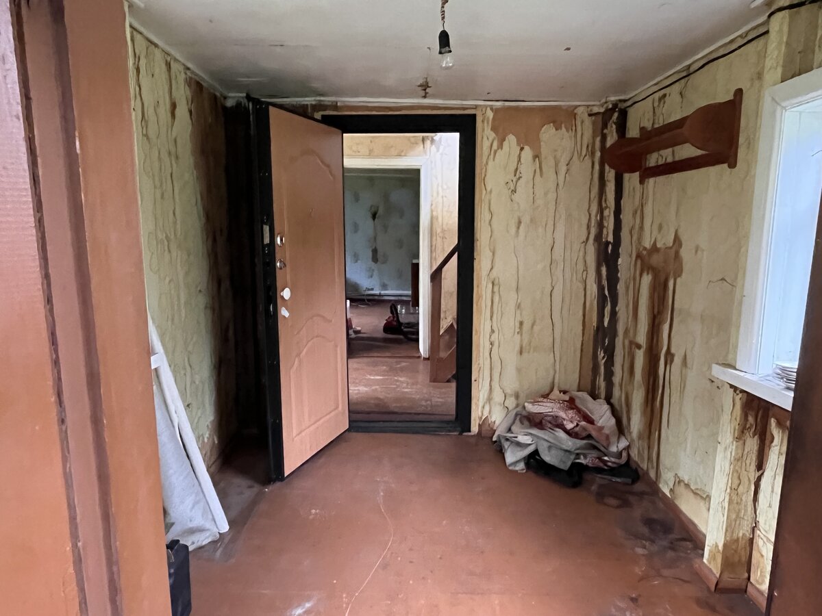 Такой пол во всем доме, но нам его основательно подпортили: некачественно покрыли тонким слоем дешевого лака. И во время выгрузки контейнера и ремонта / штукатурки стен лак потерся, и в доски въелась грязь.