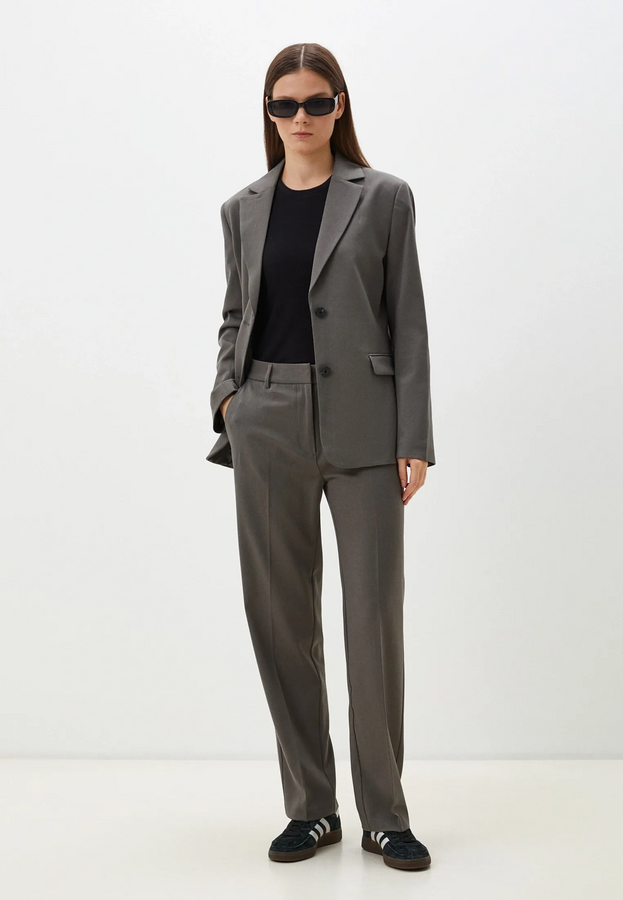 Цвет темно-серый, с карманами, в районе талии не в обтяжку, скроет небольшой животик, если есть необходимость)