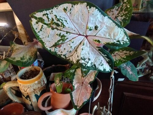 Каладиум спустя месяц, растет хорошо, пару листьев отсушил, 3 новых вырастил