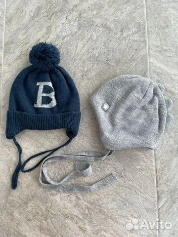 2.Шапочка светлая на завязках Coolclub, на 50 р, Забрали, вязанная шапочка с монстриком, на 50-52, 200 р, п анамка Coolclub на 48-50, 200 р
