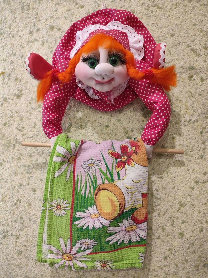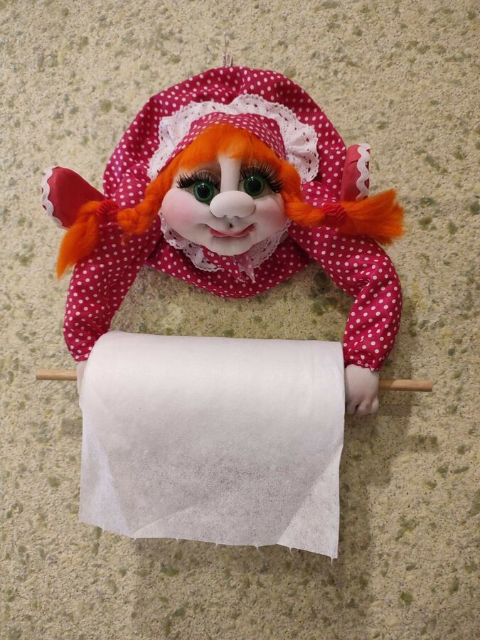 Кукла-помощница из капрона и текстиля для декора кухни и ванной. Исполняет роль держателя для текстильных и бумажных полотенец и для туалетной бумаги.