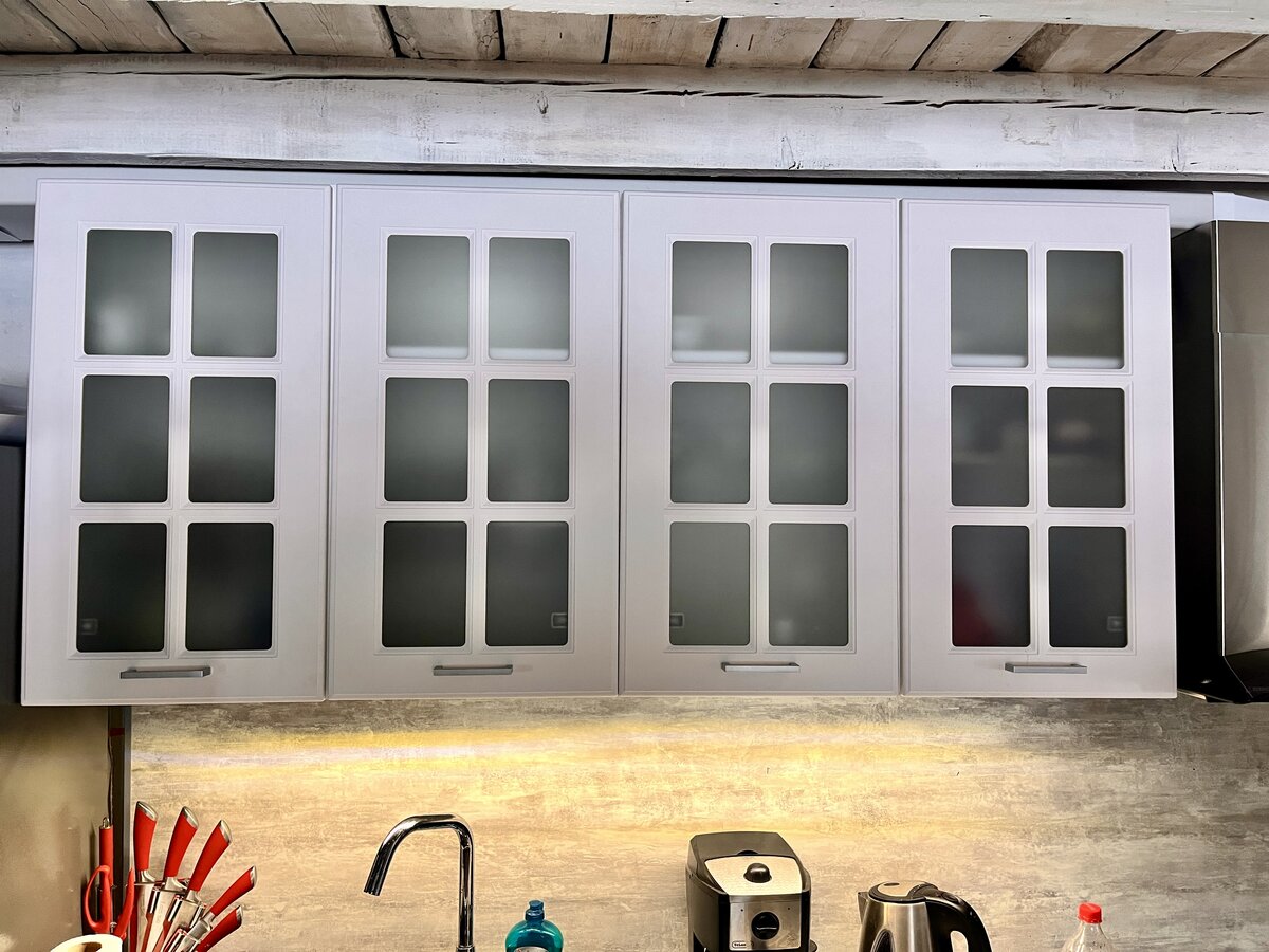 Меня беспокоят именно 2 средних дверцы. В квартире у нас верхний шкафчик широкий, с двумя створками, открывающимися навстречу друг другу. И это не доставляет неудобства. А в этой кухне рука каждый раз тянется открыть дверцу в другую сторону. А после открытия приходится делать шаг в сторону. Потому что, как правило, стоишь у рабочей поверхности, над которой расположены как раз 2 средних шкафа.