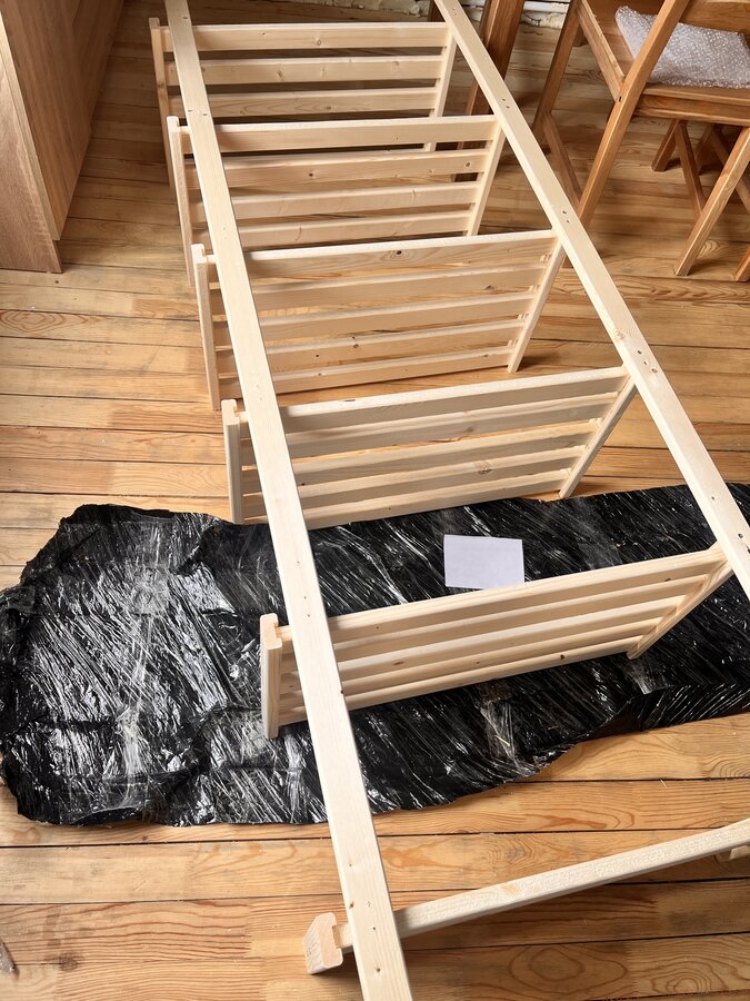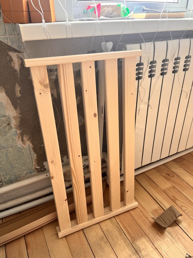 Он сделан из необработанного дерева и требует покрытия. Сначала думала покрыть лаком, но сейчас вижу, что лучше покрасить белой краской. Так он лучше будет сочетаться со шкафом.
