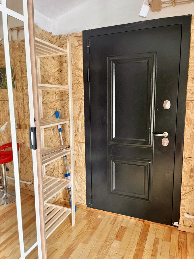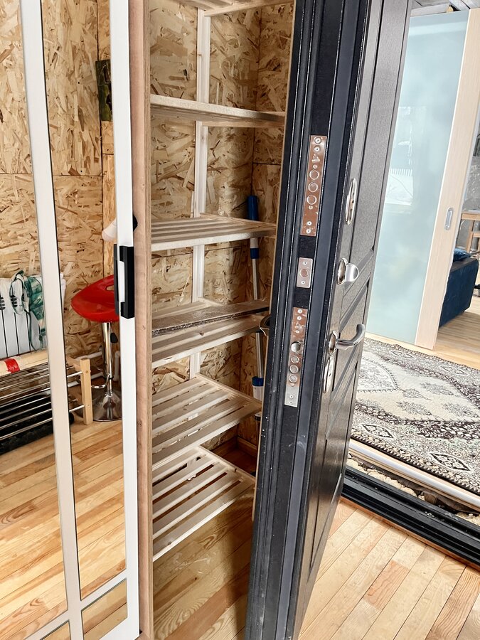 Дверь открывается полностью, стеллаж хорошо встал на все место.