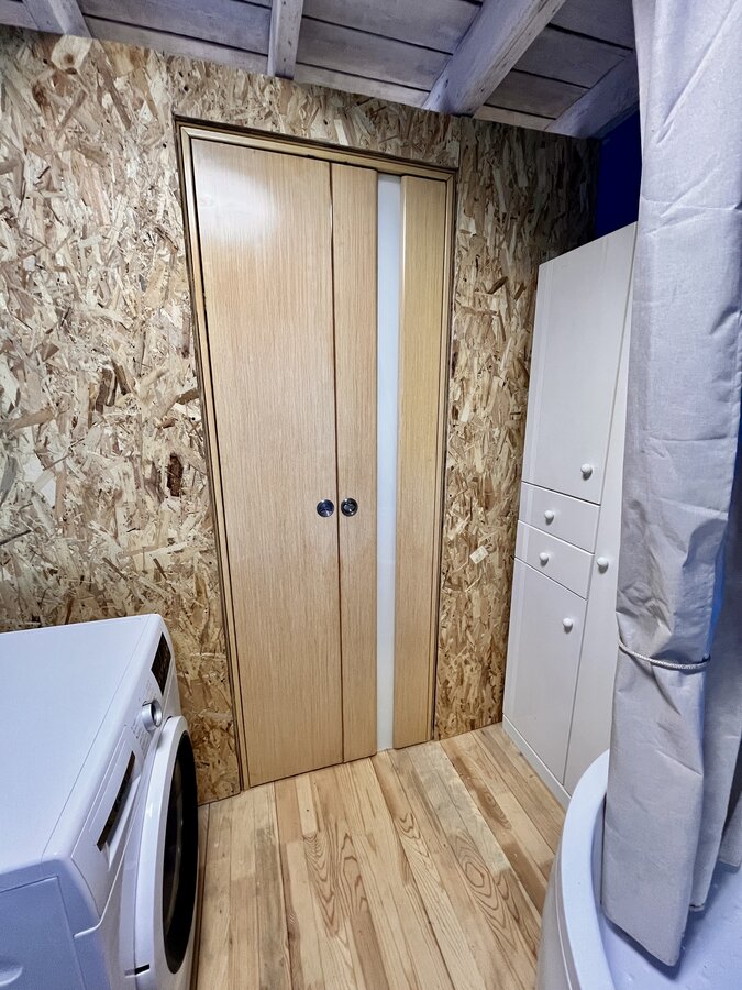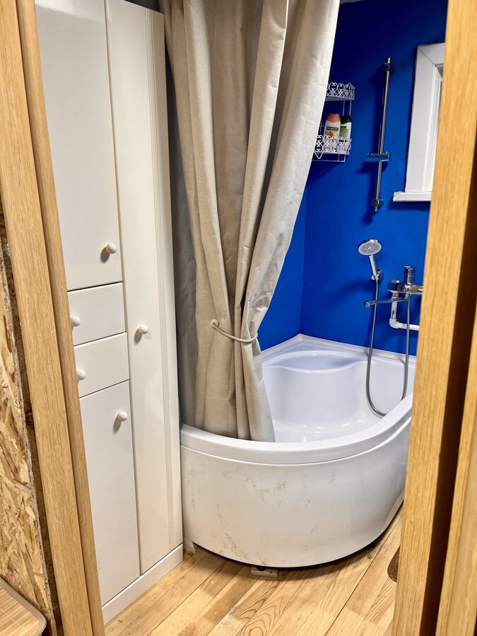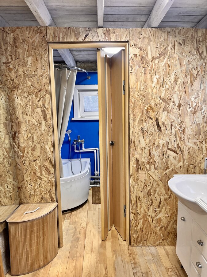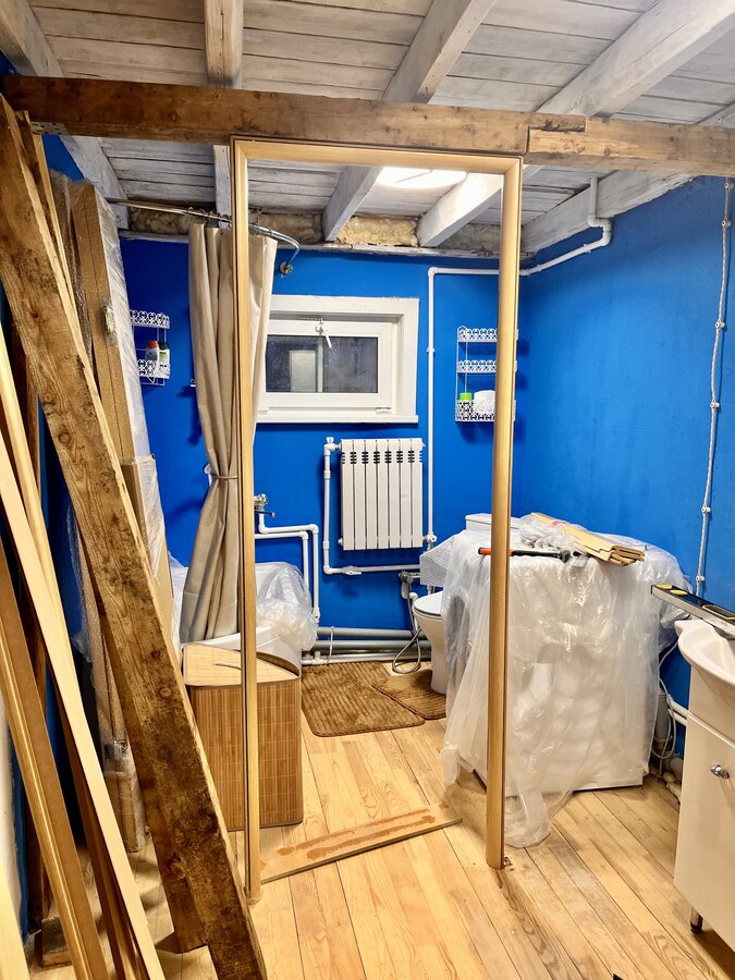 А пока уголок едет, возводим перегородку в санузле. Двери привезли в контейнере. Я была твердотельн уверена, что открываются они в левую сторону, но оказалось, что дверь - книжка складывается вправо
