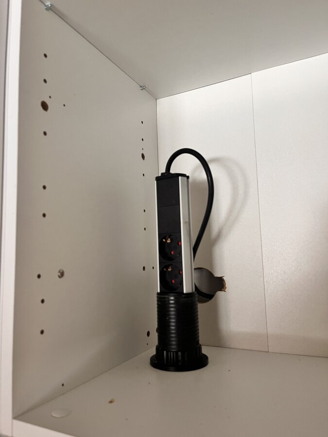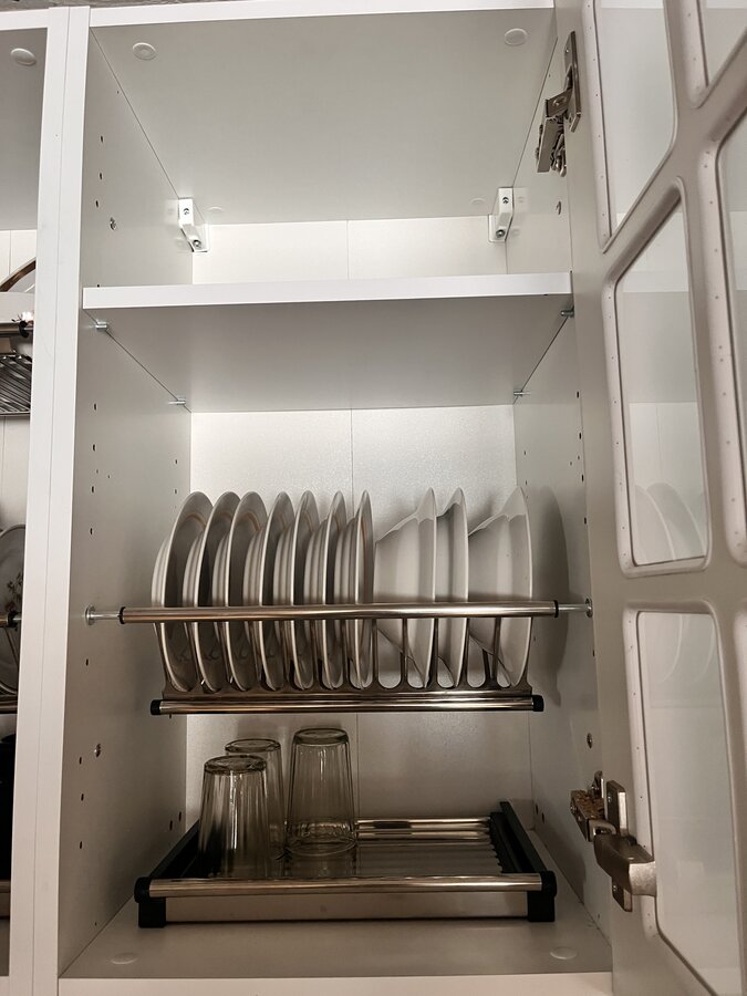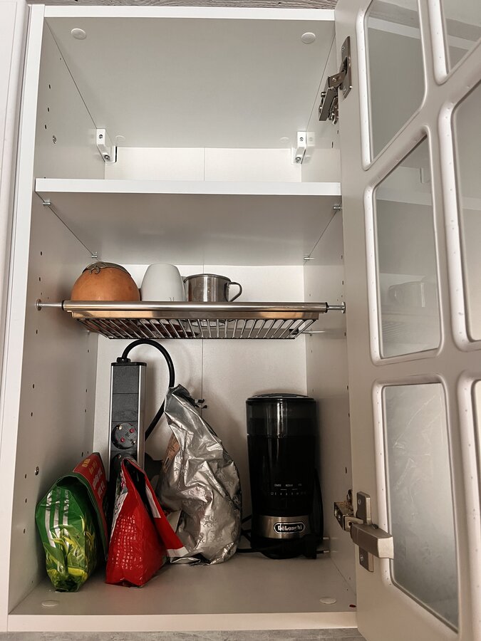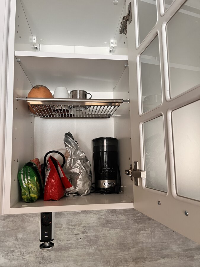 В одном из шкафчиков установлена выдвигающаяся розетка, так что установить 2 полки на нужной высоте невозможно. Пришлось заменить стандартную полочку решеткой от сушилки.