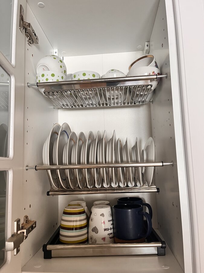 Решила пойти другим путём: установить сушилки для посуды. Сушилки, пришедшие с Озон, меня разочаровали: жестянки на пружинистых креплениях. К тому же, для них нужно было рассверливать отверстия.
