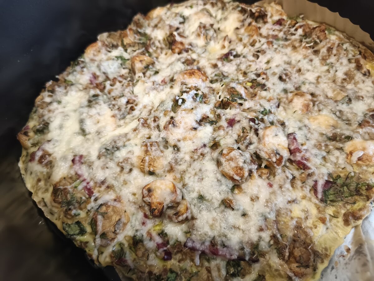 Около стакана отварной гречки осталось со вчерашнего дня, порезала 2 помидорки без кожуры, остатки твердого сыра (около 60г) натерла на терке, смешала. Заливку взяла оригинальную: 1 яйцо+сметана 1 ст.л.+соевый соус и немного мускатного ореха.