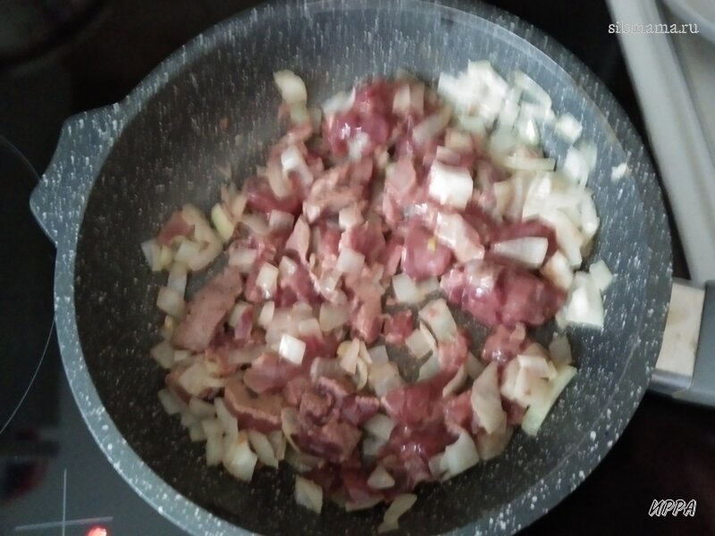 Добавляем лук. Лук обязательно. Дети говорят, что лук не едят, но здесь даже они его любят. Он практически не чувствуется, но всему блюду дает определённый аромат.