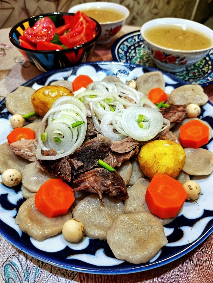 По готовности вынимаем все ингредиенты из бульона. Можно даже процедить. Ну, а дальше всё, как в любых подобных блюдах, будь то хинкал, бешбармак или жижиг-галнаш: отвариваем клёцки в бульоне, выкладываем на блюдо, сверху - разобранное мясо и ошпаренный в том же бульоне лук. С жуери гуртиком частенько подают отварную морковь и картофель. Шарики курта можно натереть сверху, а можно подать прямо на блюде. Подойдут и соленья, и свежие овощи...
