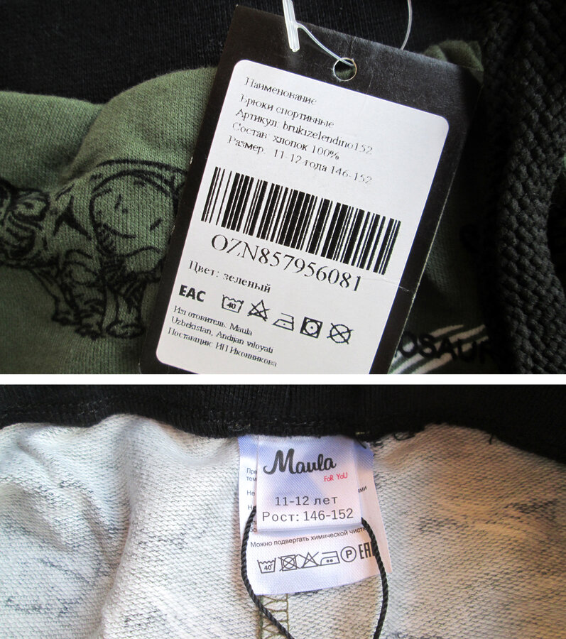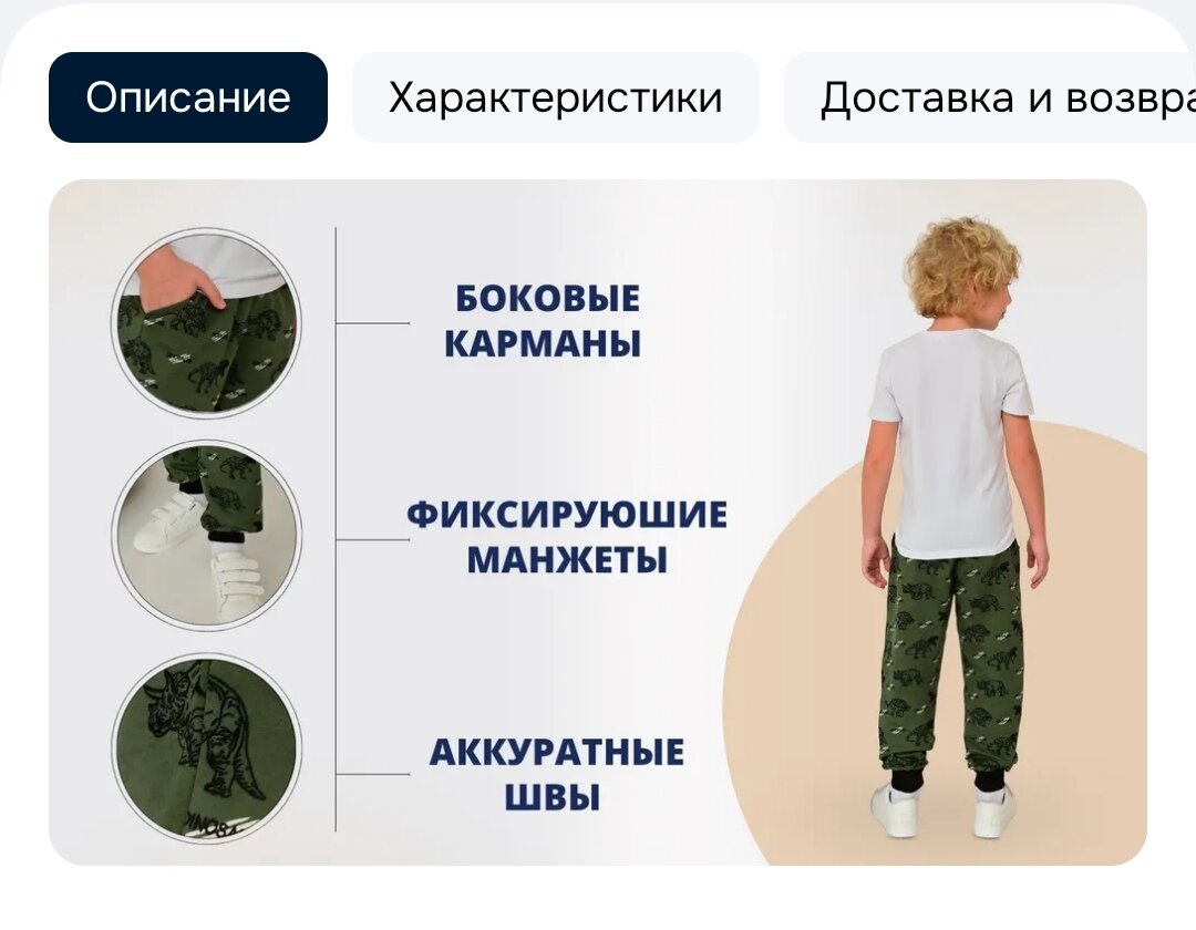 Синие: плотный хлопок, шнурок по поясу, необычные застежки у карманов и манжеты внизу.