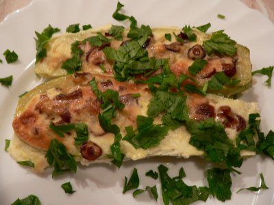 Заполнить этой массой кабачки-лодочки.