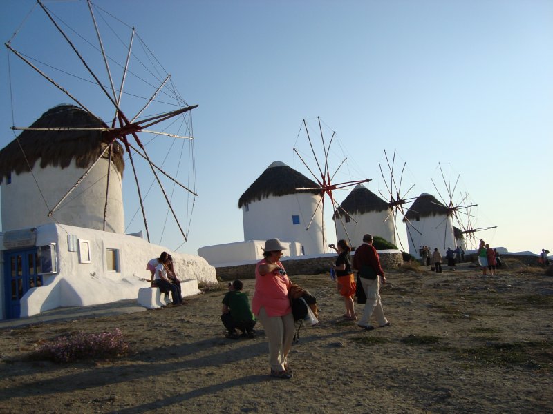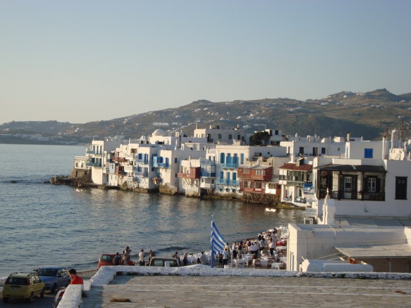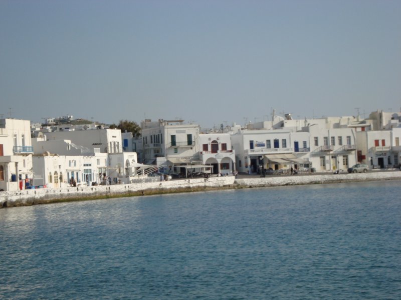 Фоторгафия с мельницами это Миконос, а местность как греки ее произносят - Платис Ялос находяться напротив первой фотографии на которой дома, как-будто в воде стоят.