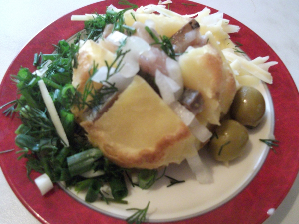 картофель помыть, завернуть в фольгу и запечь в духовке. Нужно, чтобы внутри картошка была очень мягкая, как пюре. Затем раскрыть, надрезать и положить в середину начинку. Начинки у меня были в ассортименте - тертый сыр и масло; соленые грузди со сметаной; селедка с маринованным луком; салат из крабовых палочек с кукурузой, яйцом и огурцом.
