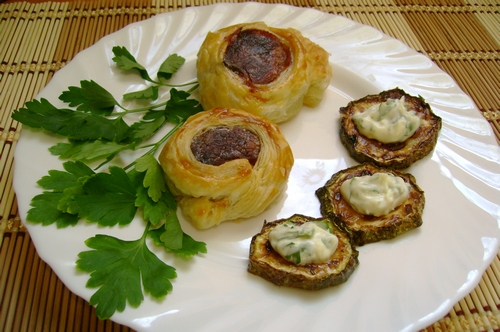 Кабачки нарезать кружочками, обжарить, немного посолить и смазать соусом: майонез/сметана, чеснок, петрушка/кинза.