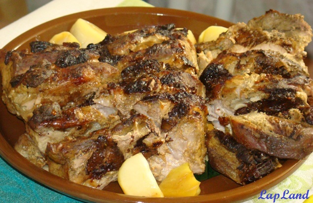 Мясо обмазываем полученной смесью. "Листы" прокладываем тонко порезанным чесноком и кусочками чернослива. Заворачиваем в фольгу и ставим в холодильник на ночь. Выпекаем в фольге час-полтора (в зависимости от величины вашего куска) при температуре 200 гр. Минут за 10 до завершения процесса открываем фольгу, чтобы дать мясу подрумяниться.