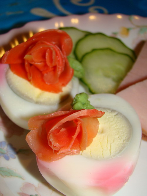 А я холодильник почистила ))) Поучился вот такой постпасхальный натюрморт. ;) В дело пошли яйца с Пасхи (извините за их внешний вид, варила и красила доча, они у неё немного потрескались, зато сама :-) ), маринованый имбирь, васаби, ну и по мелочи :haha: