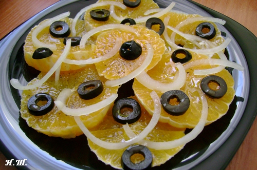 На кружочки апельсина разложить лук и оливки. Посыпать перцем и полить оливковым маслом!