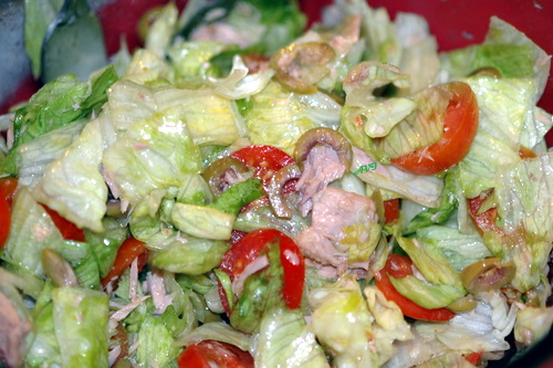 Салат вымыть и порвать руками на мелкие кусочки, оливки порезать колечками, томаты кружочками. Воду из под тунца слить, и разделить его на мелкие кусочки, добавить в салат. Заправить все оливковым маслом, добавить немного соли. При желании уже в тарелке модно посыпать пармезаном или семечками (подсолнуха, тыквы или льняными)