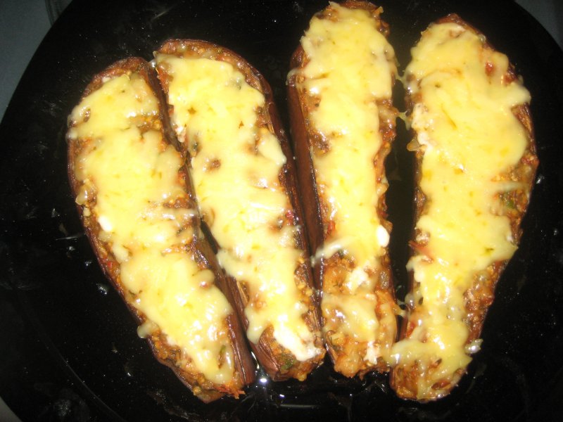 Разрезать баклажан пополам и вырезать сердцевину.Потом на сковордке обжарить лук,морковь,сердцевину из баклажан,помидоры(любые овощи можно которые есть :-) ) и я делала с курицей,можно еще с фаршем (можно без него,просто овощной вариант) .Фаршировать половинки баклажан и сверху посыпать сыром. Я делала в микроволновке на режиме гриль,т.к.духовки не было в тот момент. :hozaika: