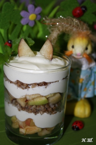 Теперь укладываем в стаканчики или креманки слоями: нарезаные фрукты, взбитую сметану, гречку и т.д. Украшаем и подаем!