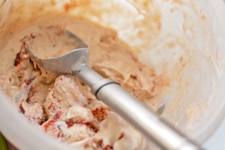Перед последним перемешиванием выложить полвину сливового пюре на мороженое и перемешать не очень тщательно. Оставшееся пюре выложить на мороженое и поставить обратно в морозилку. Лучше не смешивать сразу всю сливовую часть с основой, так будут выразительнее сливовые прожилки в мороженом.