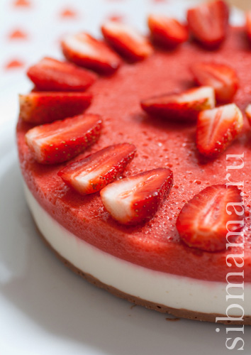 Клубнику вымыть, пюрировать блендером в однородную массу, добавить сахар. Высшим кулинарным пилотажем будет, если пюре из клубники еще протереть через сито, чтобы удалить семечки. Желатин с водой прогреть, добавить к клубнике. Опять все взбить блендером. Вылить клубничную массу в форму. Дать торту полностью застыть в холодильнике в течение 2-3 часов.