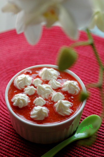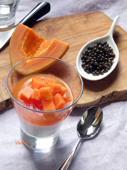 Для фруктового желе я использовала папайю (так пишется?), вместо папайи можно взять манго или абрикосы. А можно и обычные фрукты-ягоды - клубнику, малину и т.д. или даже гранат. А можно и вовсе не делать фруктовое желе, а вместо него посыпать готовую панна-котту чуть поджаренной кокосовой стружкой.
