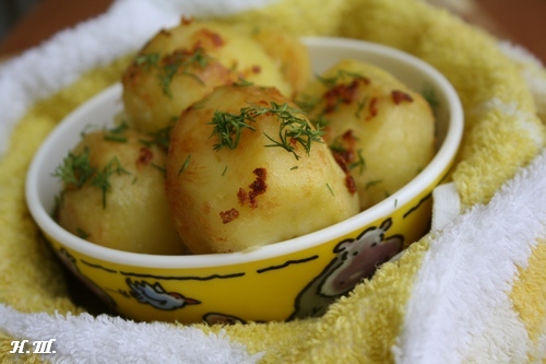 Ровные окруруглые картофелины промыть тщательно, сварить в мундирах до готовности, вынуть из воды,обсушить и раздавить (не чистить!), в разлом положить сливочное масло, уложить разломом вверх в разогретую сковороду и подержать на огне до легкой поджаренности нижней части.