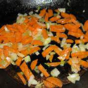 Добавляем фарш и жарим его минут десять, пока он не будет хорошо обжарен и распадаться на мелкие крупинки.
