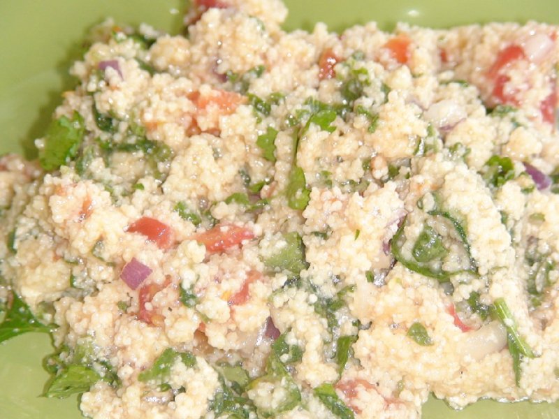 Мяту и петрушку нарезать очень мелко. Стакан кус-куса залить 1 стаканом кипятка, добавить несколько капель оливк. масла масла и щепотку соли и оставить на 3-4 минуты, пока кус-кус не впитает всю воду.