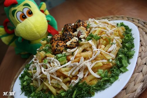 Примечание:Это один из вариантов салата "Гнездо глухаря". Очень сытный и нами любимый "не полезный" салатик.  |