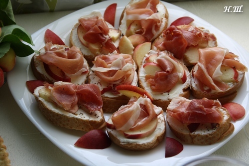 Пармская ветчина на брускетте с рикоттой,нектарином,медом и черным перцем: