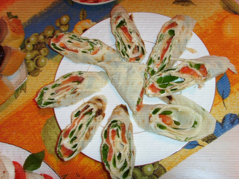 Рулет из лаваша с с/с семгой,зеленым лучком и творожным сыром с паприкой
